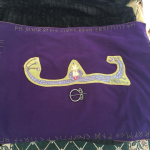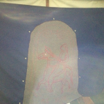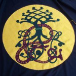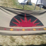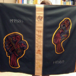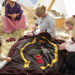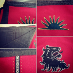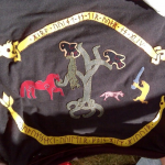 Close up of AS 44 An Tir West War Hero’s Cloak Work party for AS 44 Hero’s Cloak - AS 45: Bestowed upon Sir Arnsbjorn by King Alfar and Queen Ketiley of The West. Creation led by Katherine de Langele.